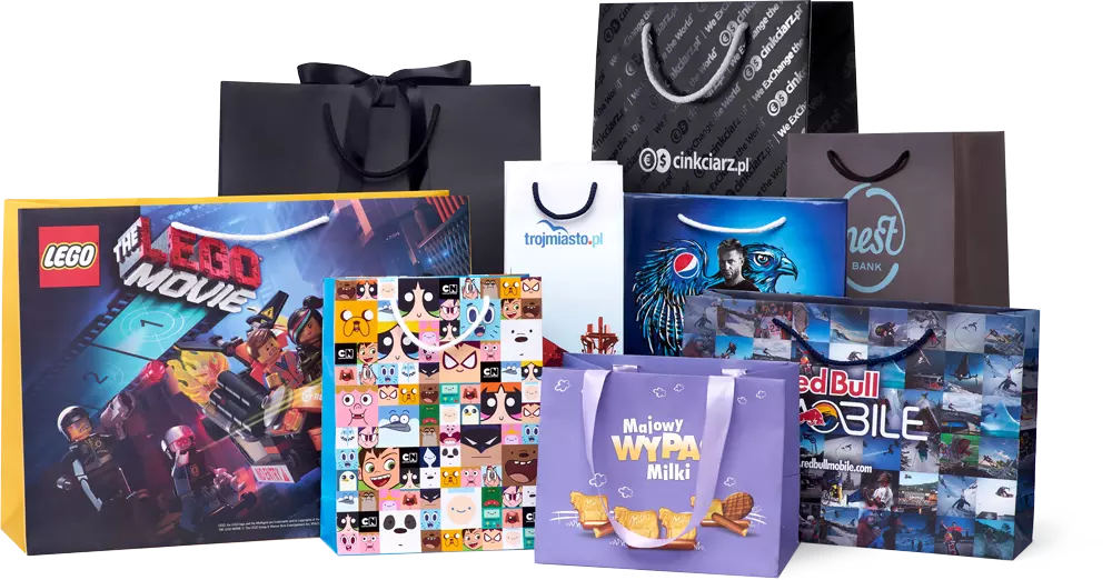 Papiertaschen mit Druck und Papierhenkeln stellen eine wirtschaftlichere Alternative zu laminierten Taschen dar. Sie werden vor allem für die Verpackung von Kleidung und Lebensmitteln verwendet. Da sie aus recyceltem Papier hergestellt werden können, ist ihre Umweltbelastung gering.